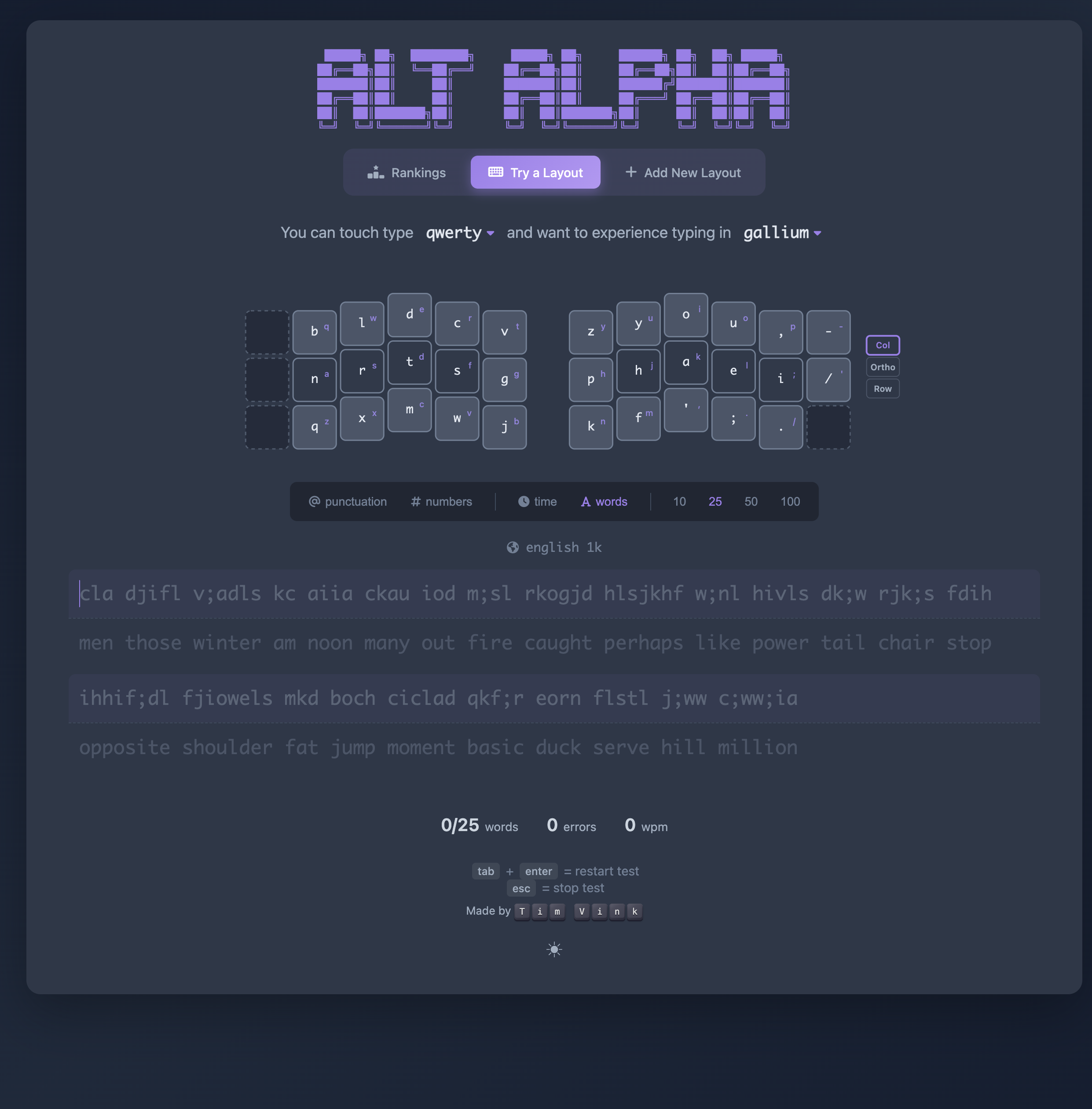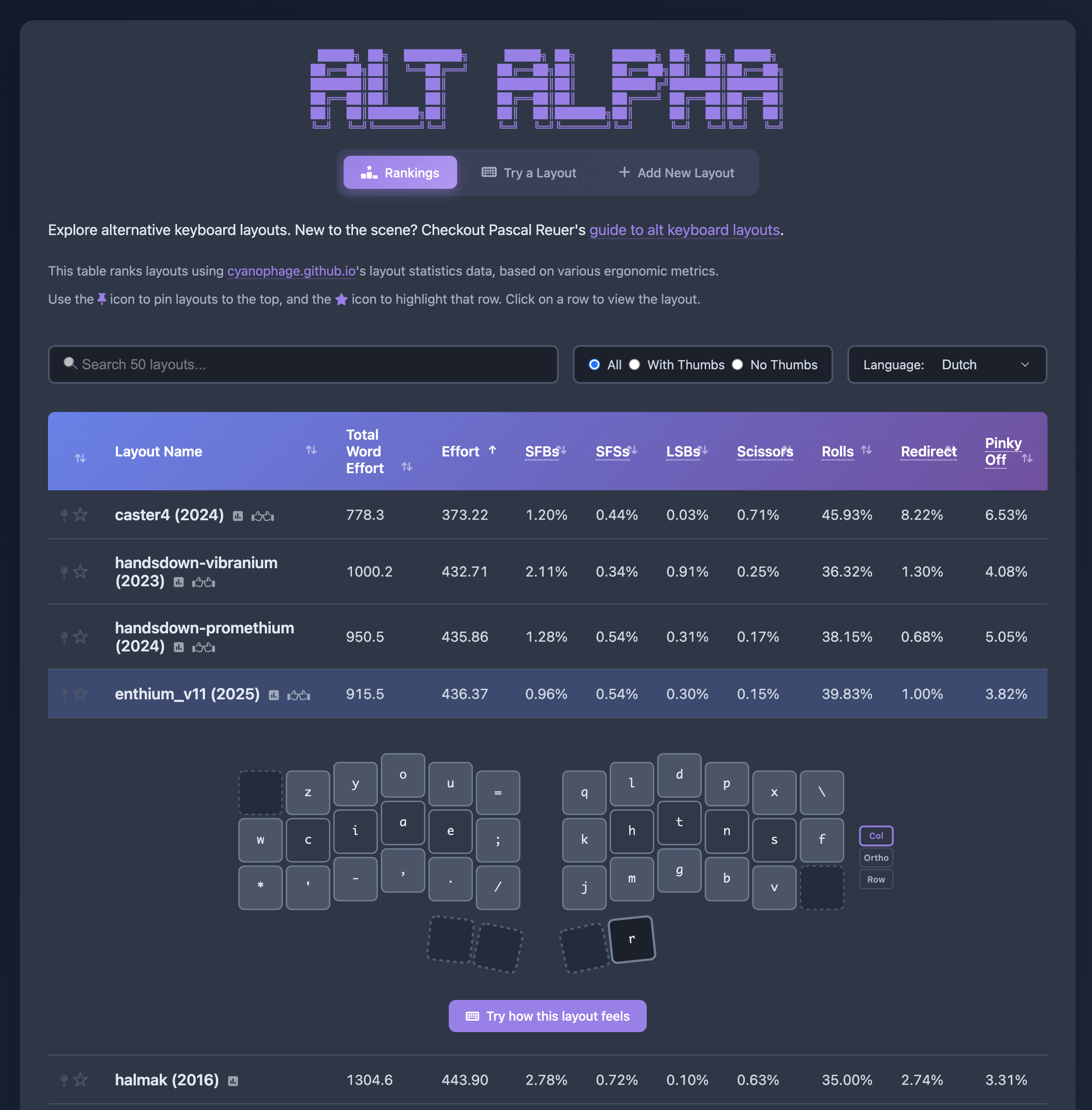 Almost a year ago I switched to the ZSA Voyager, a programmable, ergonomic split keyboard that features four thumb buttons per hand instead of the single spacebar found on traditional keyboards. After having a lot of fun optimizing my keyboard layout and customizing shortcuts, I got interested in alternative alpha keyboard layouts. The 'AKL' scene is still actively developing new layouts with many great new options in the last two years. I found it hard to choose and fun to compare, so in this post I'll introduce a new tool I built: altalpha.timvink.nl